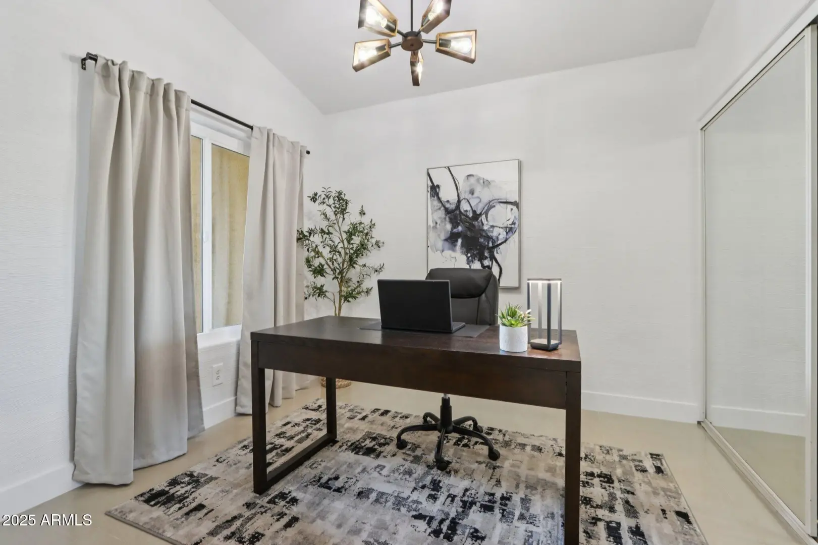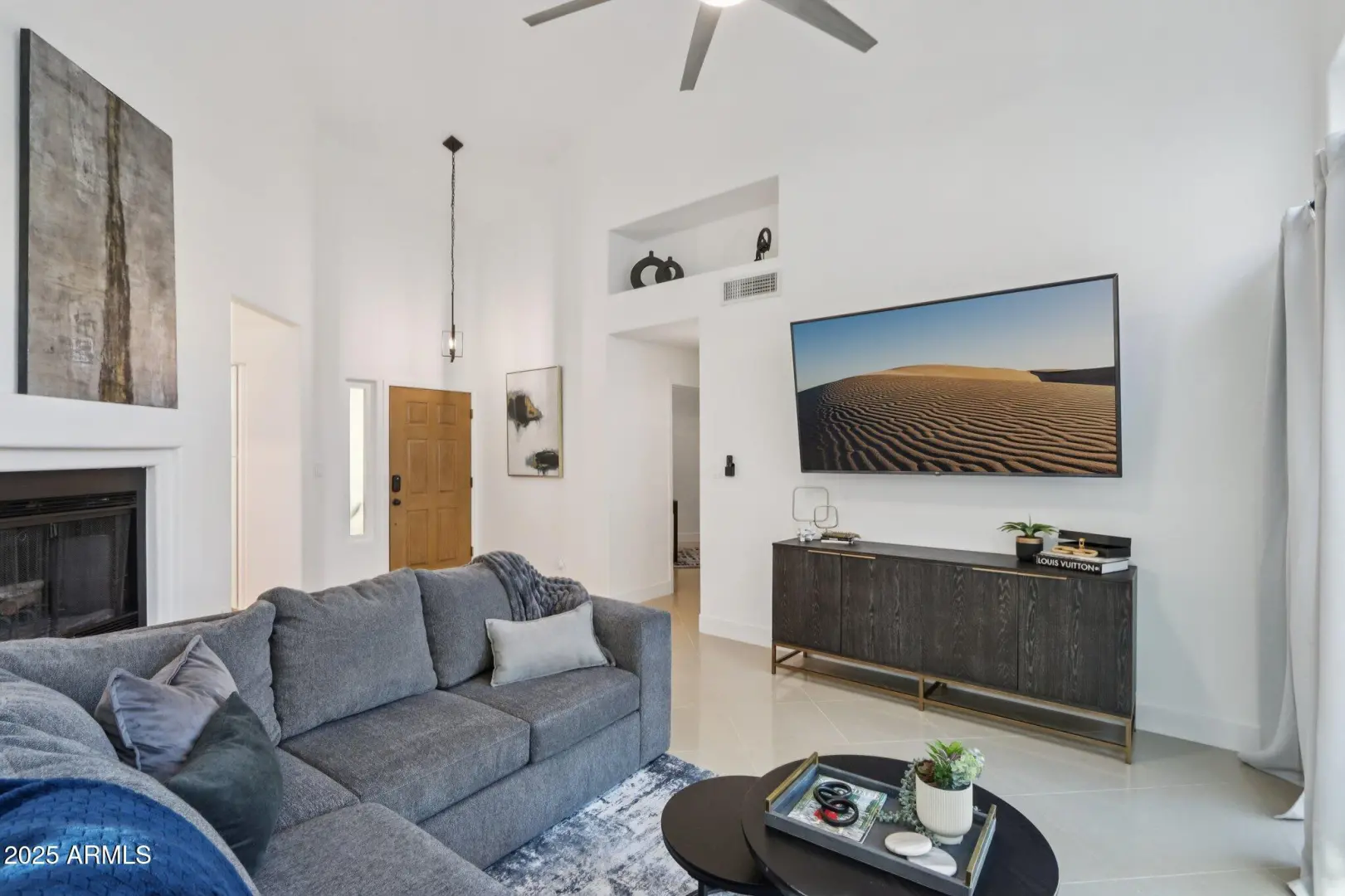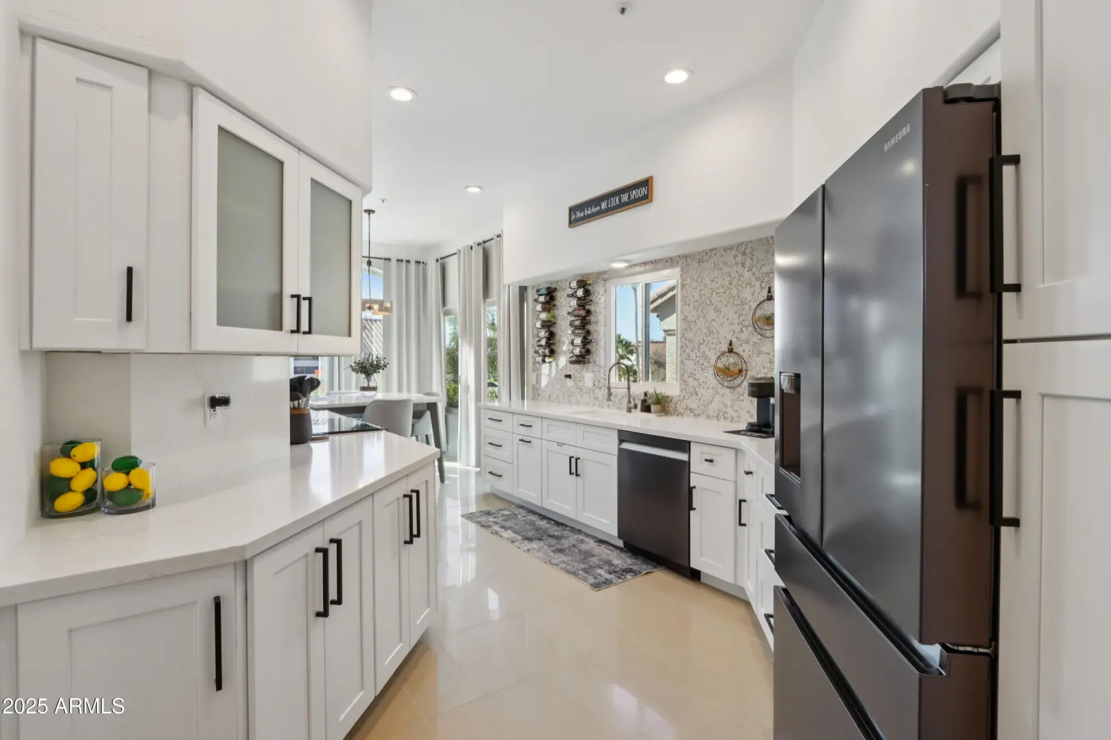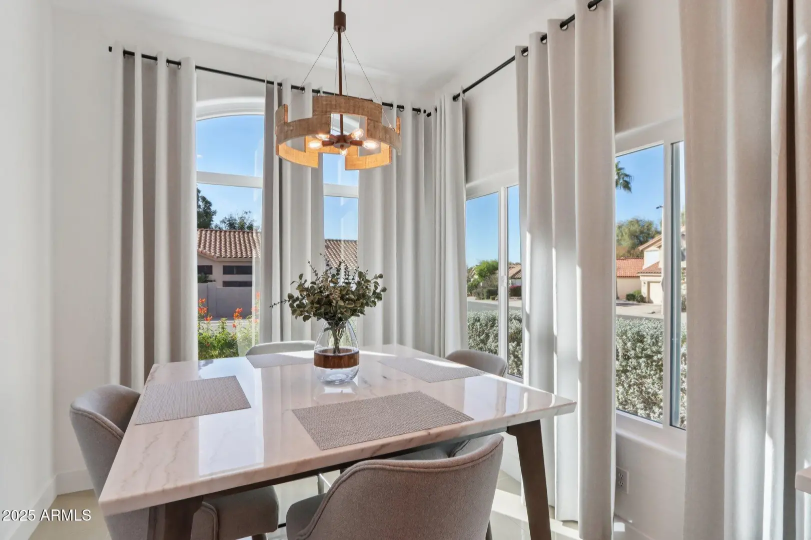 Welcome to this beautifully updated 3-bedroom, 2-bath single-story home in the heart of Mountain View Ranch, one of North Scottsdale's most loved neighborhoods. With over 1,500 sq ft of thoughtfully upgraded living space, this residence perfectly blends comfort, modern design & a bright open floor plan where natural light fills every room. Featuring vaulted ceilings throughout including all new windows & sliding glass doors throughout. The home showcases a complete kitchen renovation, featuring white shaker cabinetry, black stainless-steel appliances, Custom tiled backsplash accompanied by hanging wine racks, floating shelves, stylish finishes & a eat in kitchen nook. The family room is open to the formal dining area w/ a dual wood burning fireplace, sliding glass doors &