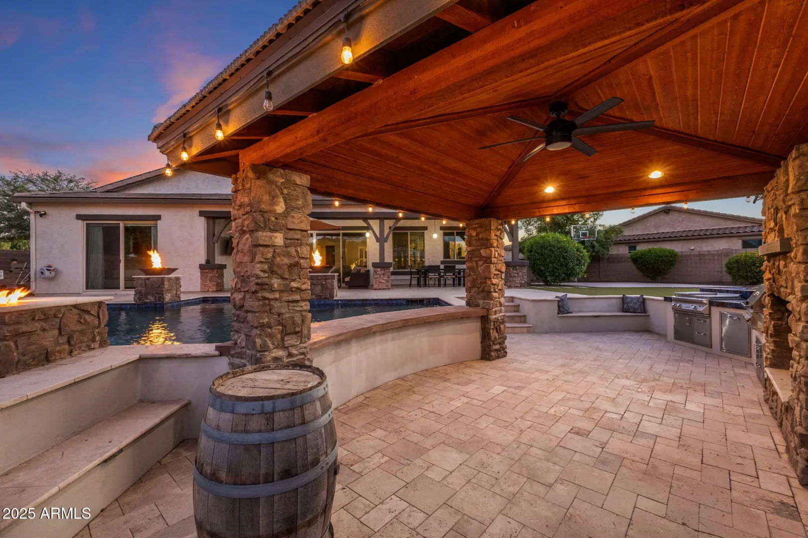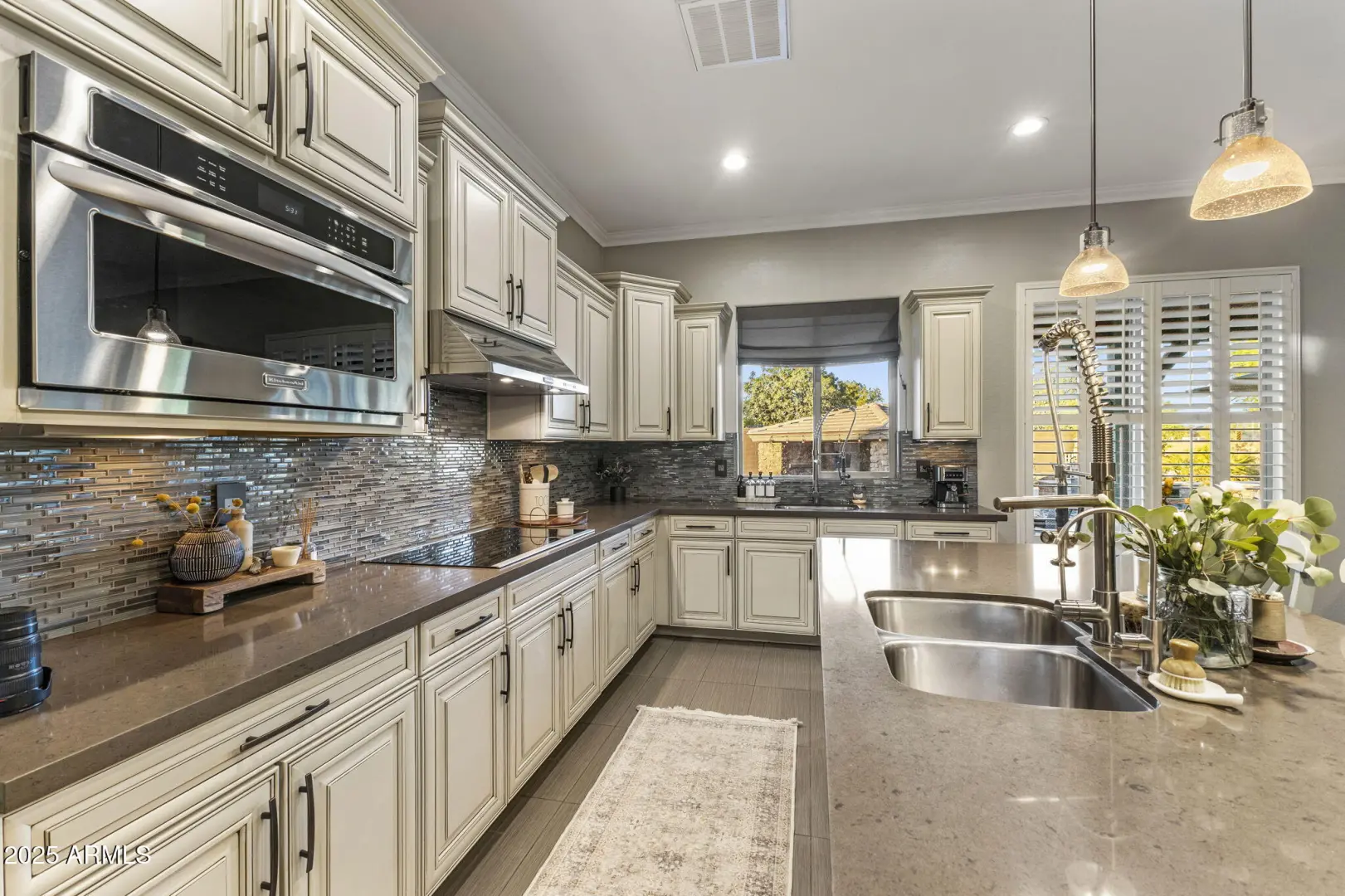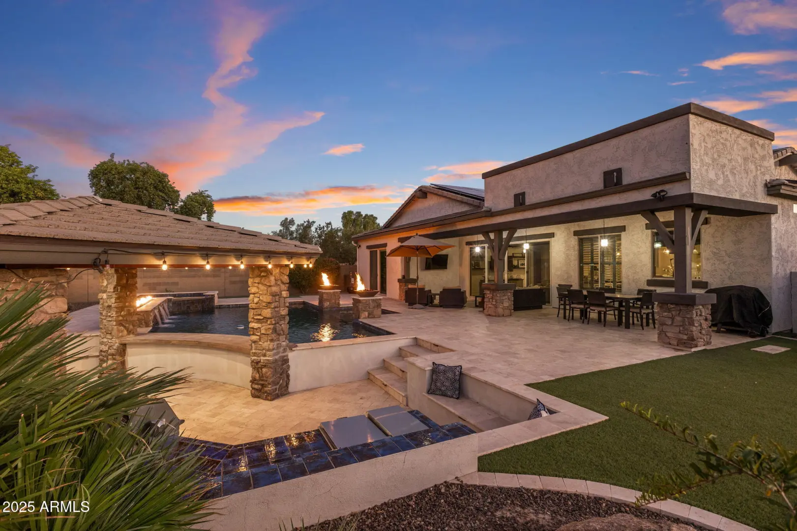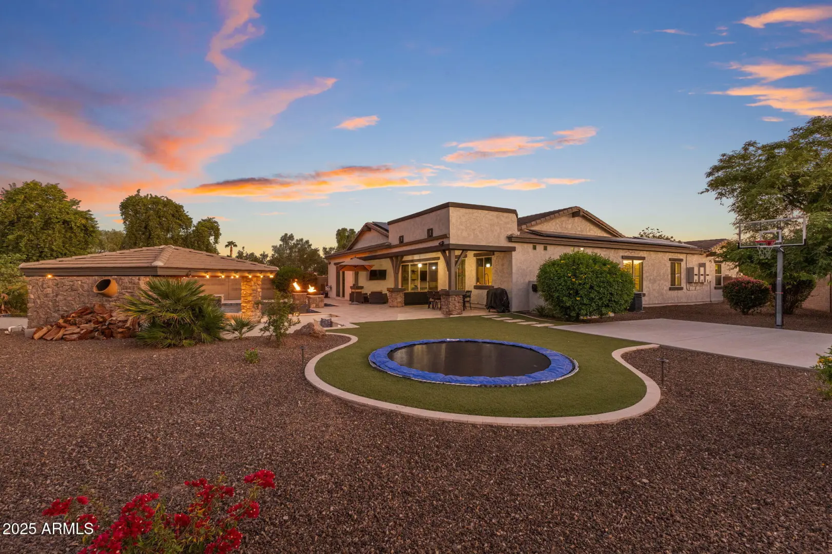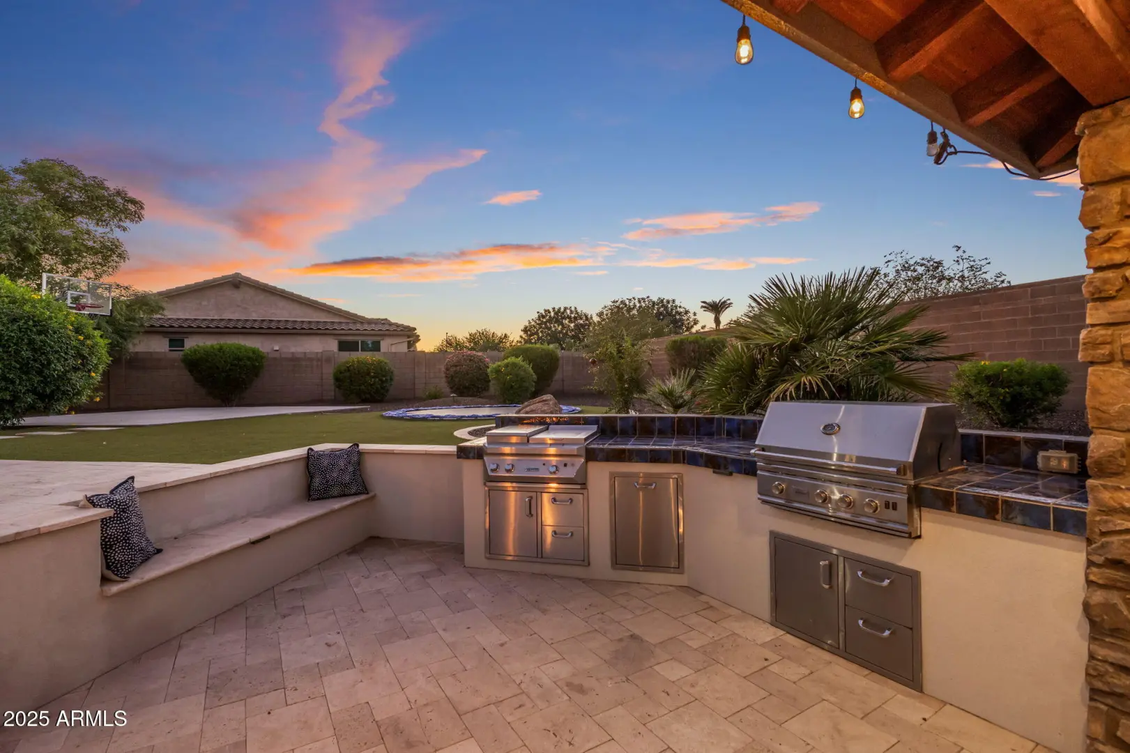 Tucked away on a private cul-de-sac lot in Gilbert's highly desired Velvendo community, this 4 bedroom, 3 bath home offers 2,826 sq. ft. of stylish living with a true balance of function and comfort. The open floor plan highlights a large great room with extended sliding glass door, perfect for indoor-outdoor living. A dedicated office and den (currently used as a workout room) provide flexible space for work and play. The chef's kitchen is designed with upgraded cabinetry, quartz countertops, a spacious island, double ovens, and a built-in microwave. The retreat-style primary suite offers dual vanities, a large walk-in shower, custom walk-in closet, and private exit to the backyard. Three additional bedrooms and two full bathrooms