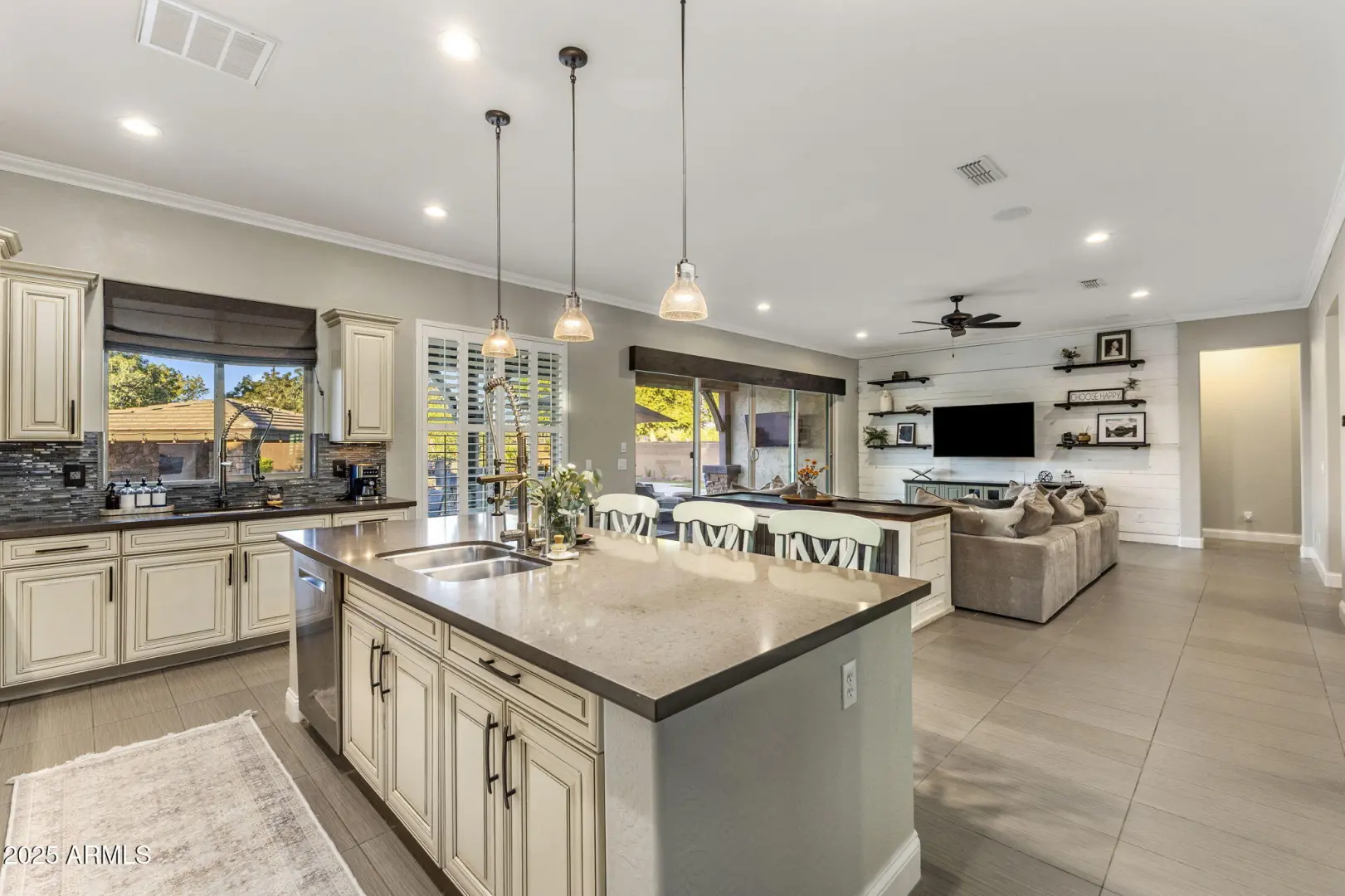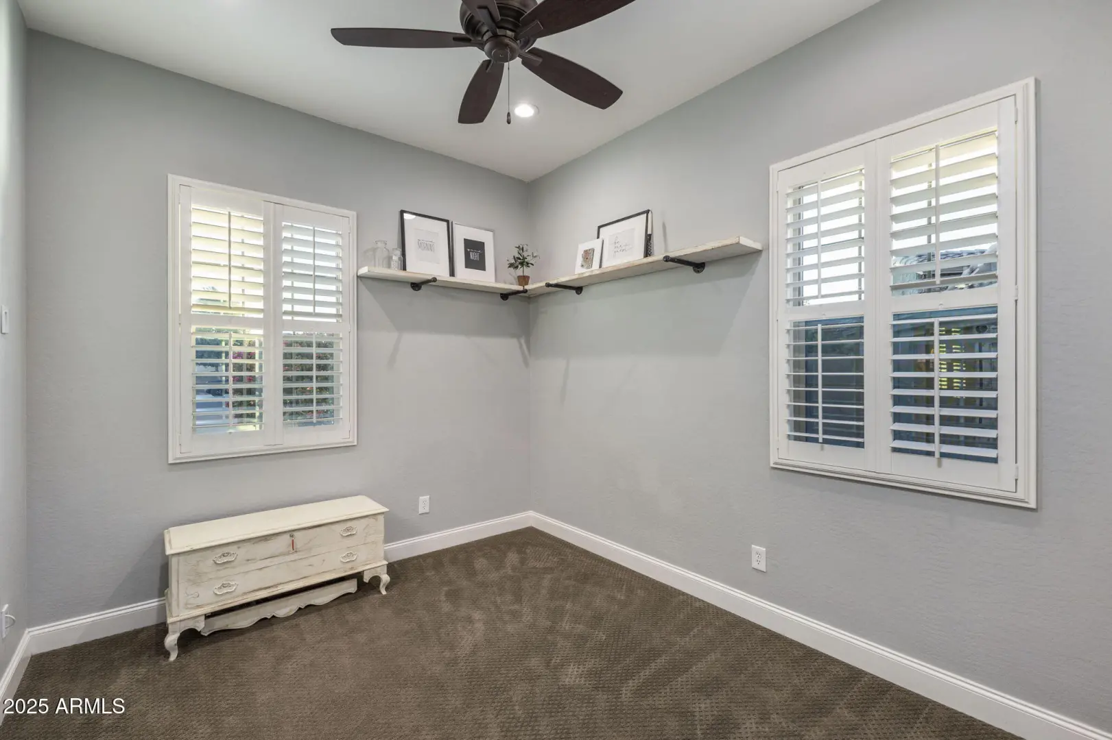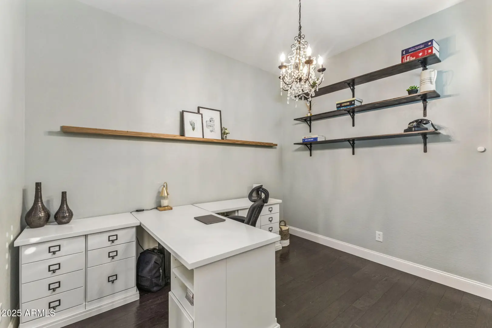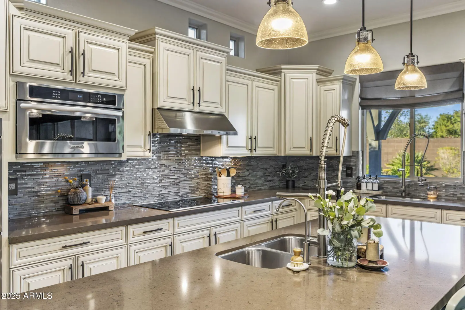 Tucked away on a private cul-de-sac lot in Gilbert's highly desired Velvendo community, this 4 bedroom, 3 bath home offers 2,826 sq. ft. of stylish living with a true balance of function and comfort. The open floor plan highlights a large great room with extended sliding glass door, perfect for indoor-outdoor living. A dedicated office and den (currently used as a workout room) provide flexible space for work and play. The chef's kitchen is designed with upgraded cabinetry, quartz countertops, a spacious island, double ovens, and a built-in microwave. The retreat-style primary suite offers dual vanities, a large walk-in shower, custom walk-in closet, and private exit to the backyard. Three additional bedrooms and two full bathrooms