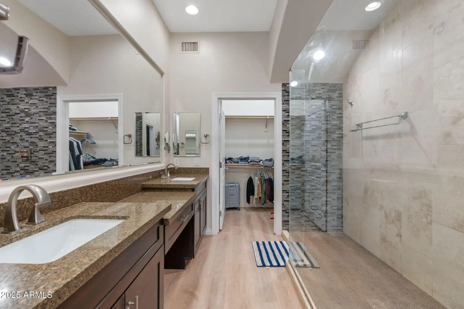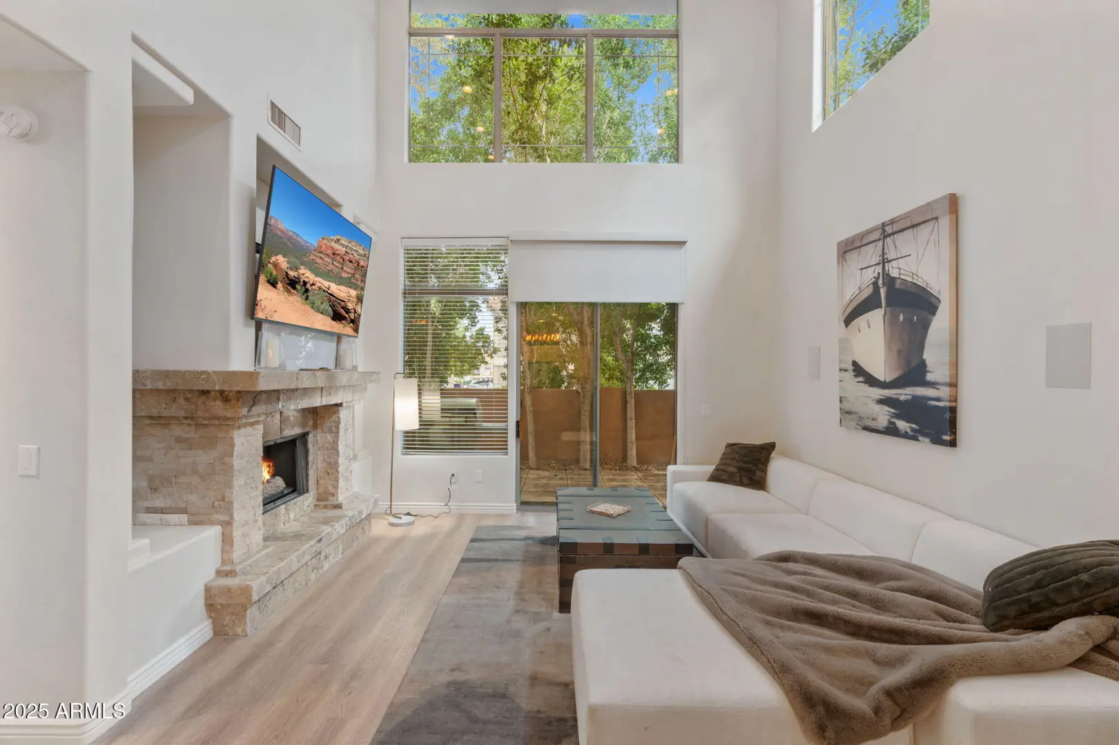 Welcome to your Scottsdale retreat—where privacy, style, and convenience meet. Behind a gated entry, this beautiful home features a lush courtyard and a serene backyard escape. The kitchen showcases honed quartzite countertops, a limestone backsplash, and newer appliances. The great room impresses with soaring 20+ ft ceilings, a natural stone gas fireplace, built-in surround sound, and a custom shade over the slider. Upstairs, enjoy a spacious loft with a private balcony. The primary suite offers granite finishes, a travertine shower, and shutters. Additional highlights include epoxy garage floors, custom built-ins, and designer touches throughout. Perfectly located near TPC, Barrett-Jackson, the Arabian Horse Show, golf, dining, hiking, and freeway access.