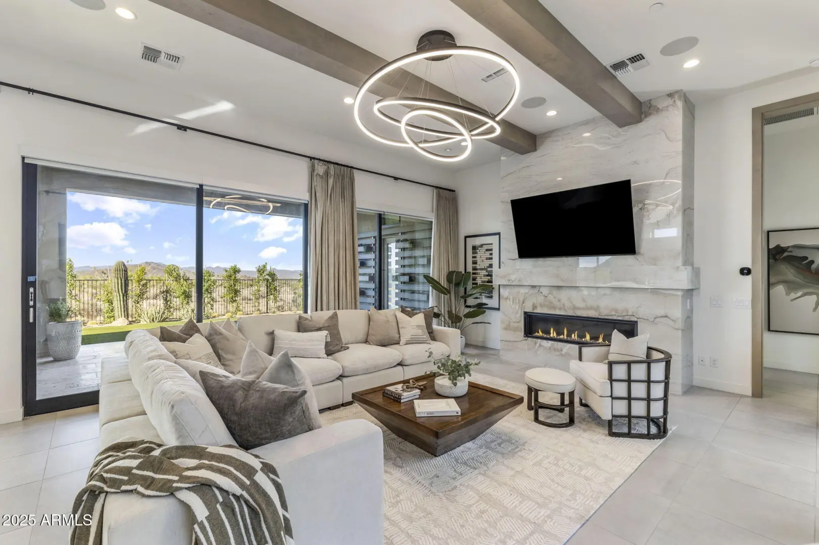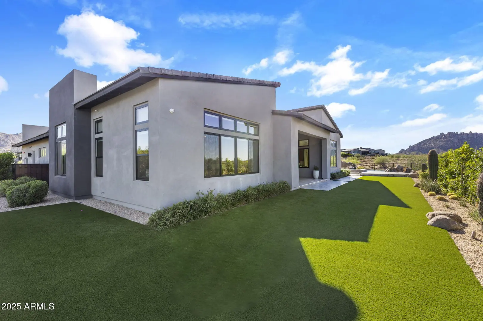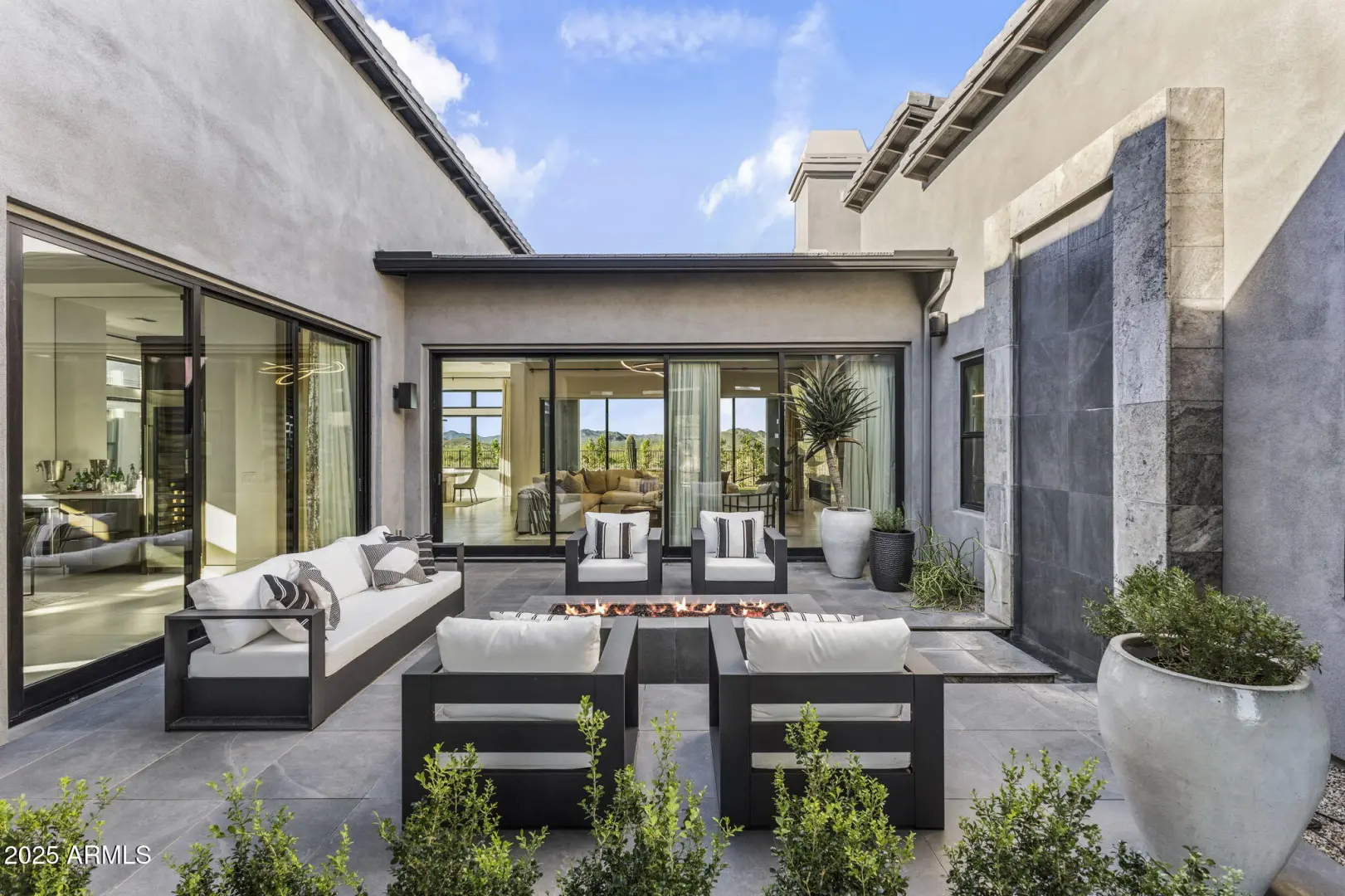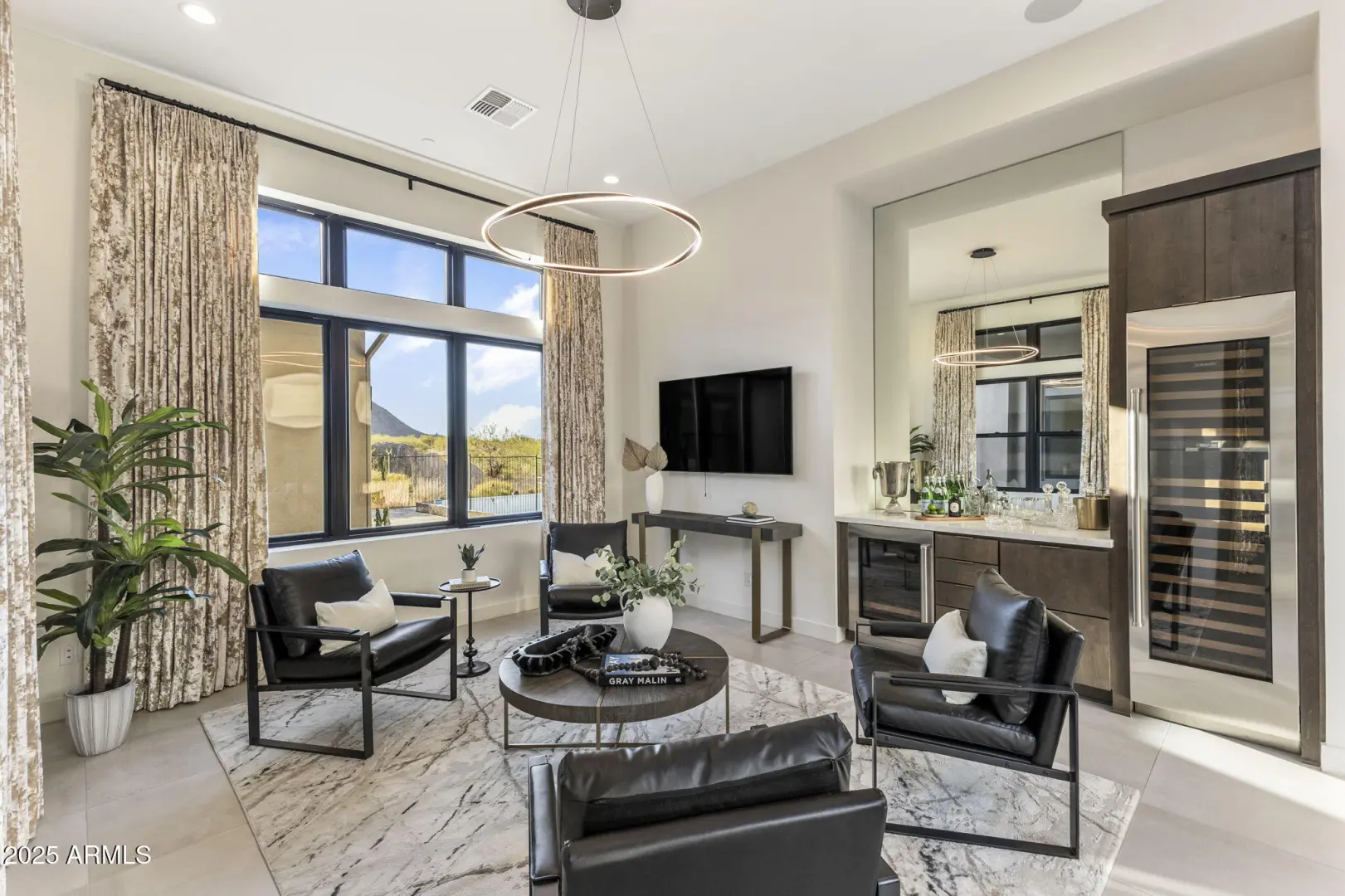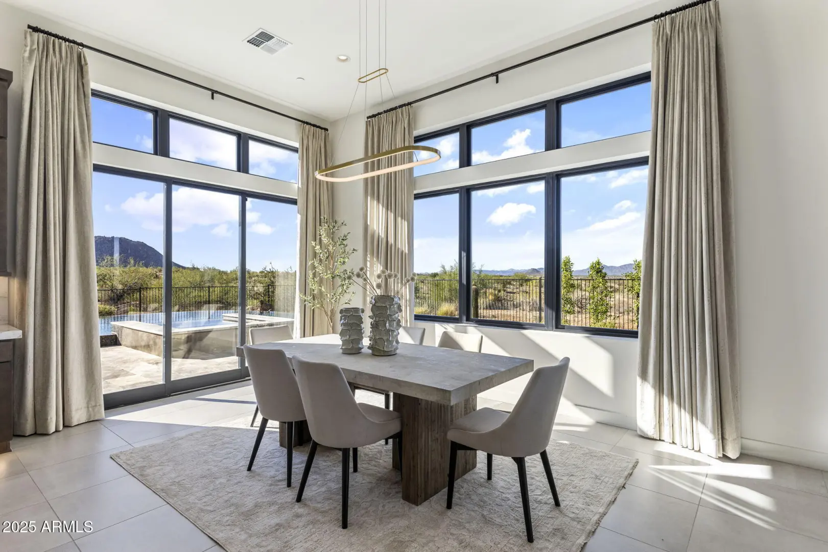 Nestled in the exclusive guard-gated community of Sereno Canyon, this newer single-level residence captures the essence of luxurious modern desert luxury. Framed by the dramatic McDowell Mountains and surrounded by pristine desert landscape, the home blends contemporary architecture with timeless design, creating a serene retreat just minutes from Scottsdale's finest dining, shopping, and golf. Step inside to soaring ceilings, expansive windows, and an open-concept floor plan that floods the interiors with natural light. The spacious great room flows seamlessly into a chef's kitchen, where sleek cabinetry, premium appliances, and a generous island make entertaining effortless. Multiple living and dining spaces provide flexibility for both grand gatherings and intimate evenings at home.