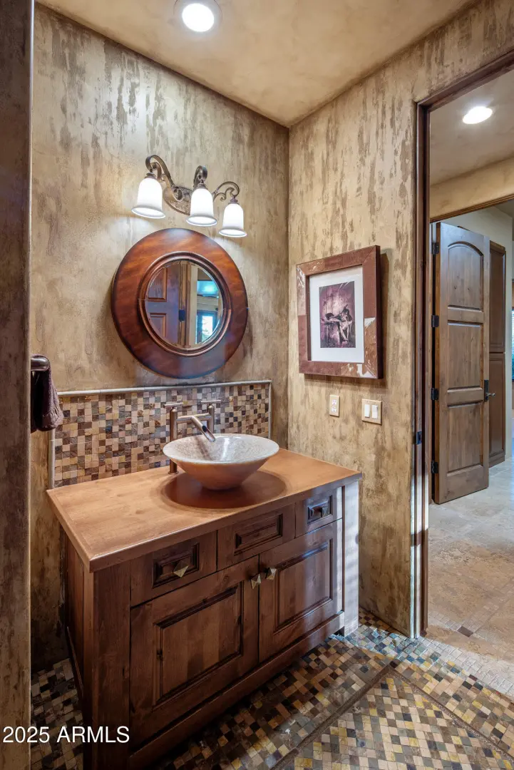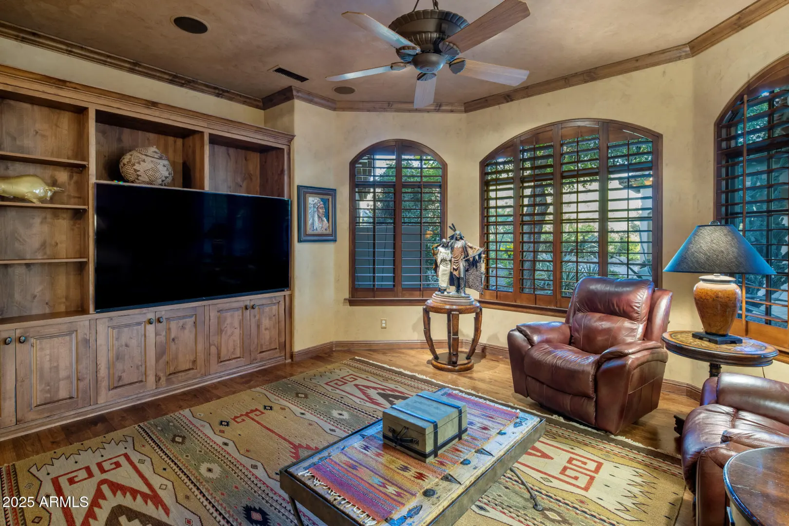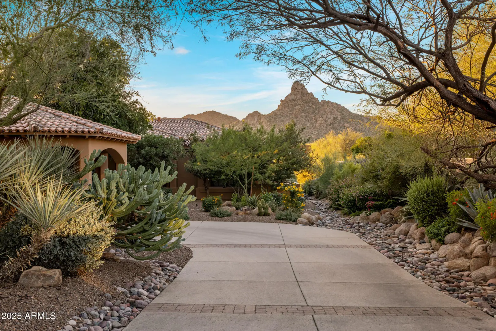 Welcome to a custom-built residence that epitomizes classic Arizona living in exclusive Windy Walk Estates of Troon. Perfectly positioned along the third green of the prestigious Troon Country Club golf course, this single-level home captures breathtaking views of North Scottsdale's iconic Pinnacle Peak, city lights & the lush golf course. A private desert landscape & elegant circular drive leads to a residence where craftsmanship & comfort unite. Inside, timeless design unfolds through hand-finished walls, rich alder cabinetry, custom built-ins & natural stone finishes that exude warmth & elegance. The chef's kitchen impresses with a generous granite island, double ovens & custom cabinetry including built-in desk - seamlessly opening to the inviting great room & formal living areas, all