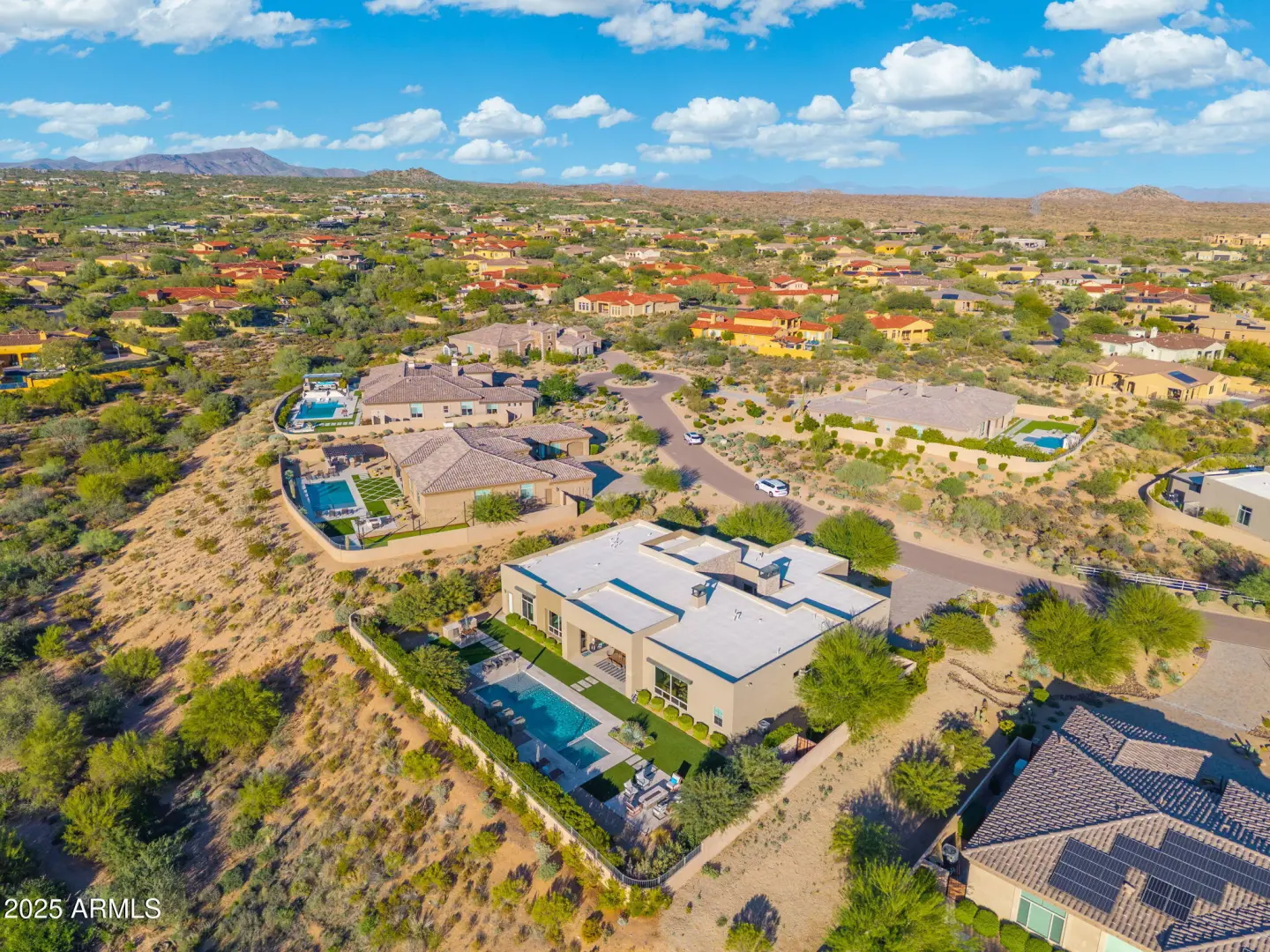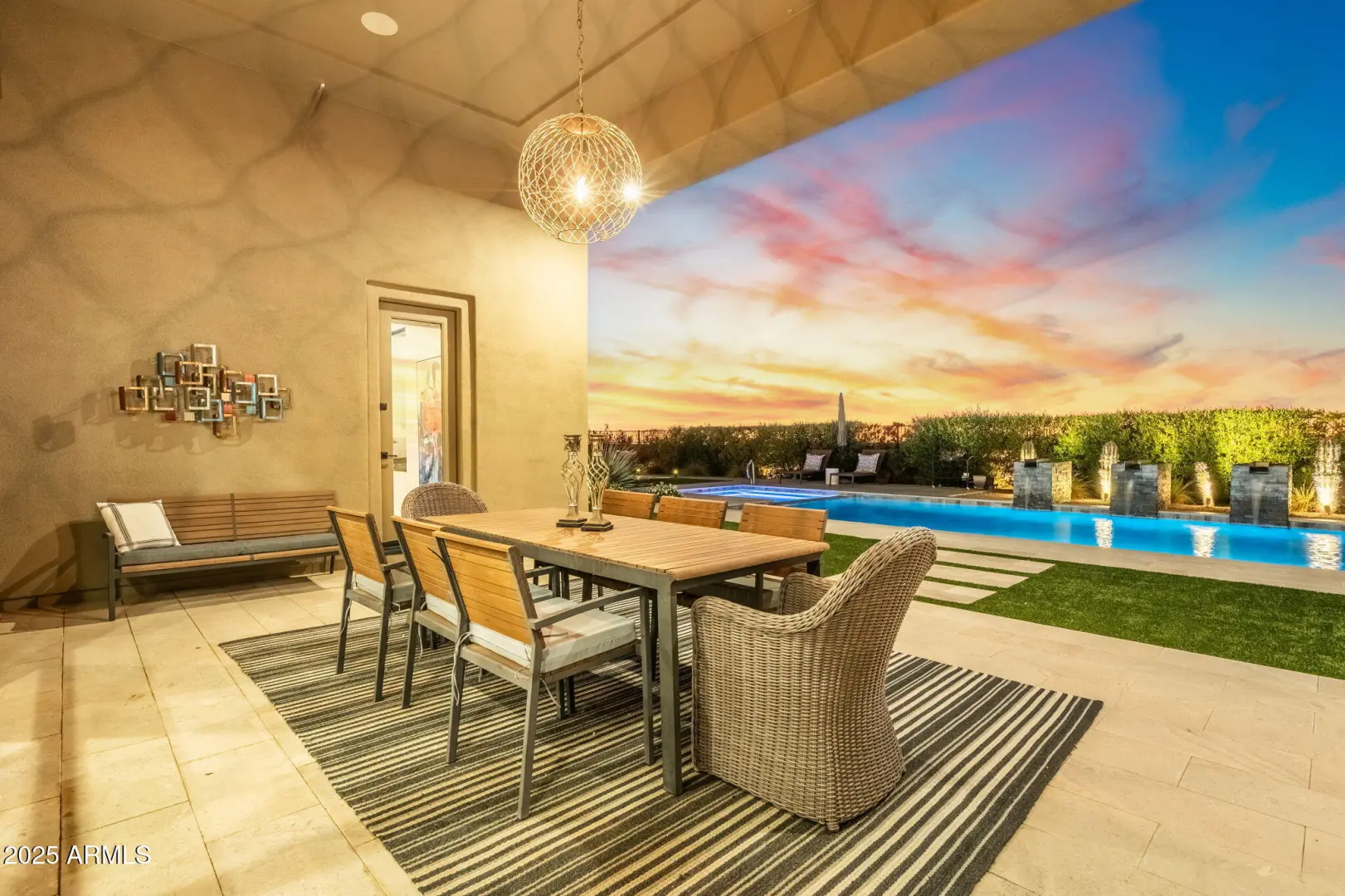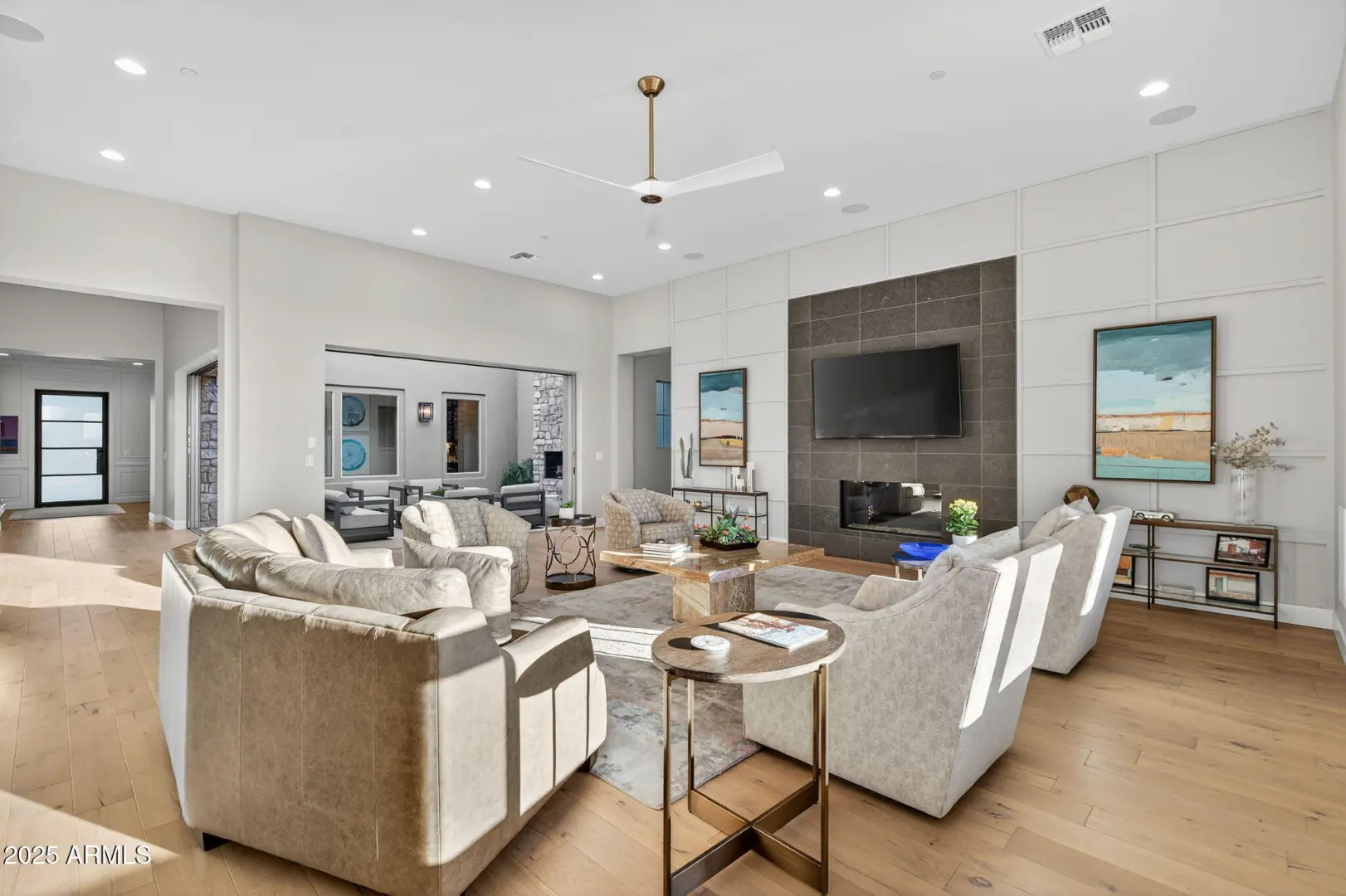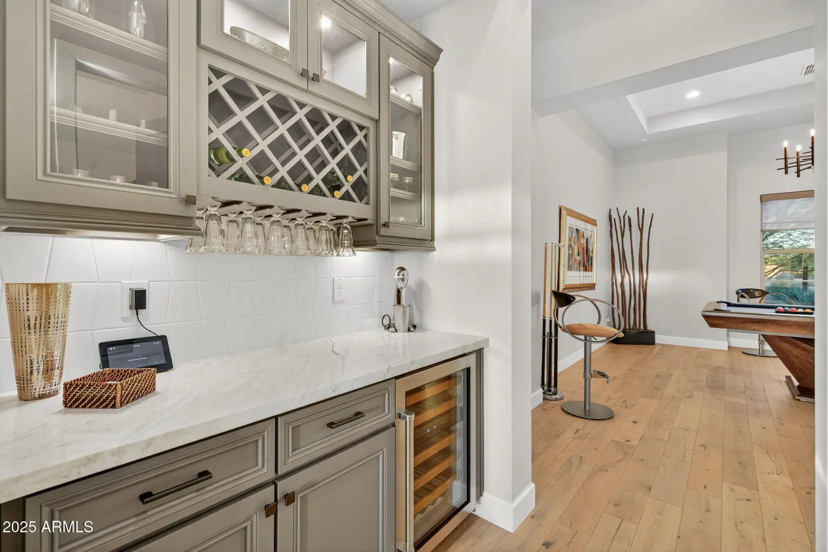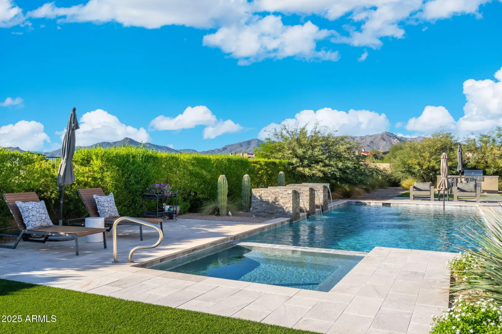 This stunning, highly upgraded, Rosewood Desert Contemporary home is located on an elevated lot offering spectacular sunset and mountain views within the secluded gated enclave of Rosewood Summit Estates. The spacious open floorplan features an interior courtyard with outdoor fireplace and two disappearing walls of glass that allow for seamless enjoyment of Arizona's glorious indoor/outdoor living. Luxurious updates include deco paneled entrance foyer, beautiful contemporary limestone fireplace, automated blinds, whole home water filtration, and a butler's pantry with built-in wine fridge. The gourmet chef's kitchen offers a huge island w/ bar seating, Subzero/Wolf appliances, marble countertops, upgraded cabinetry w/ upper glass doors, and walk-in pantry. The expansive master suite