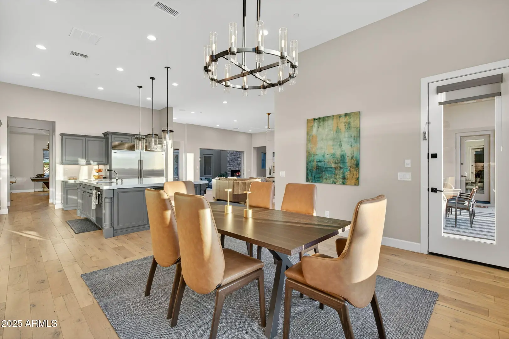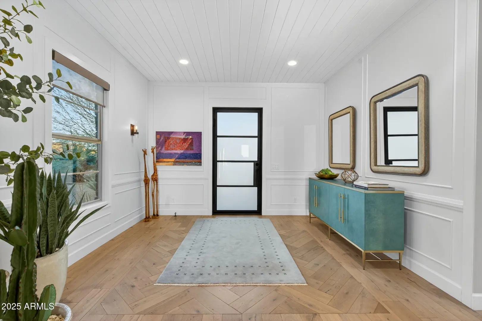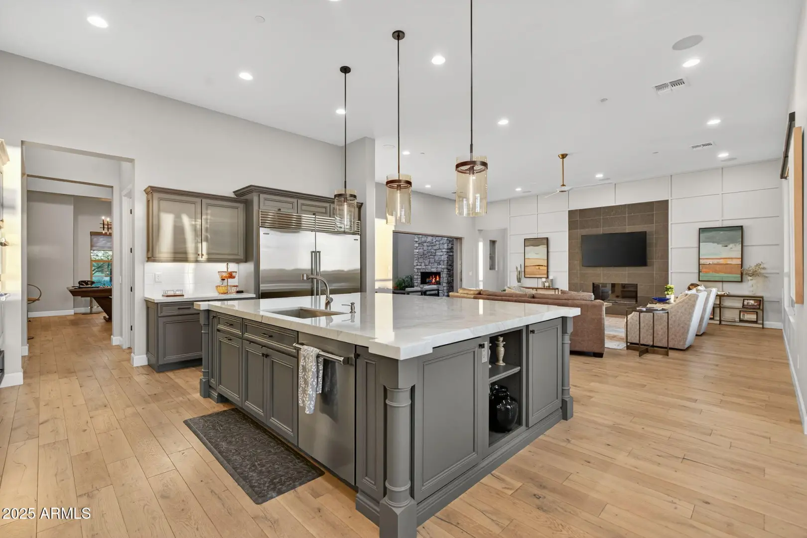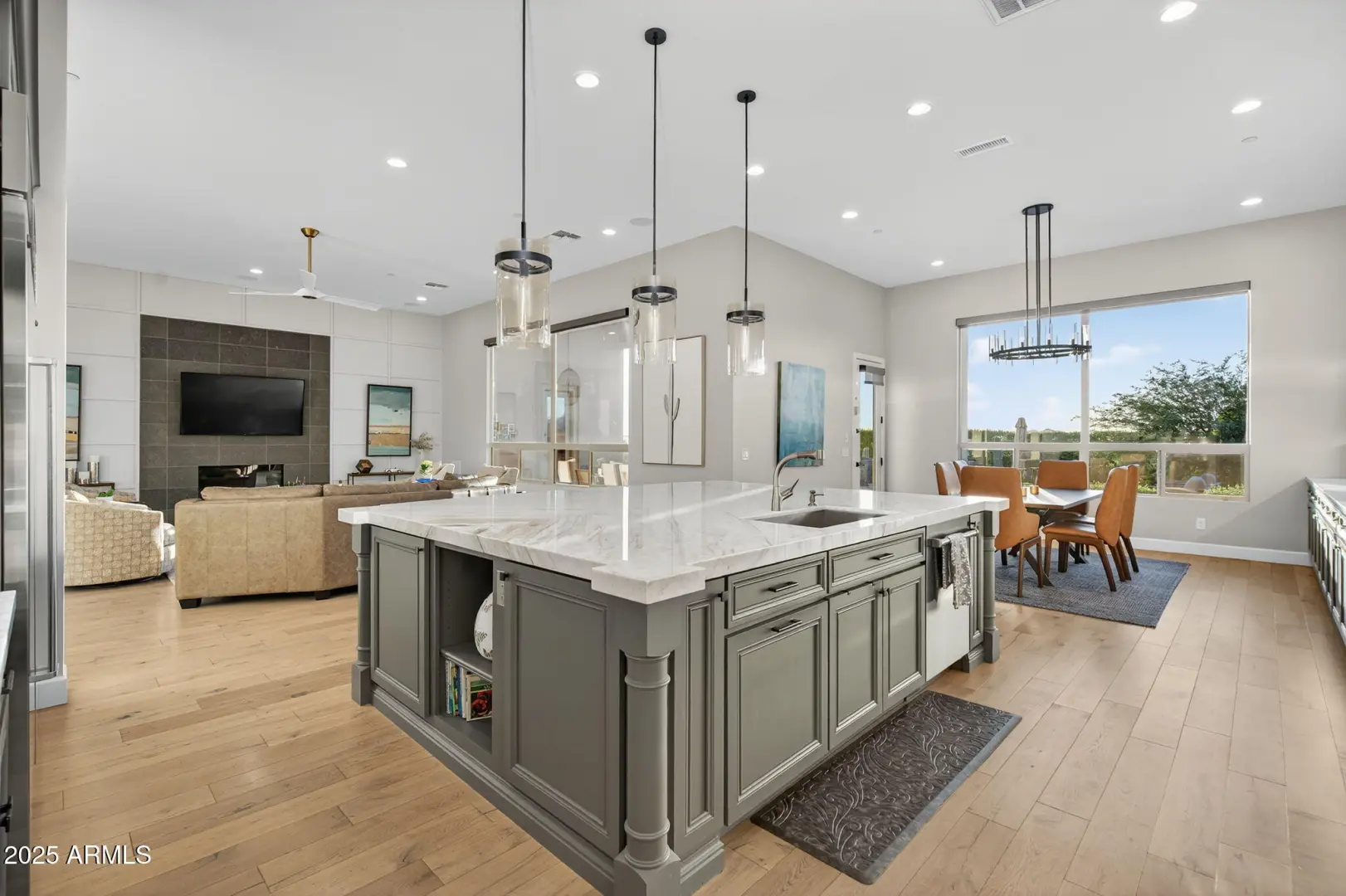 This stunning, highly upgraded, Rosewood Desert Contemporary home is located on an elevated lot offering spectacular sunset and mountain views within the secluded gated enclave of Rosewood Summit Estates. The spacious open floorplan features an interior courtyard with outdoor fireplace and two disappearing walls of glass that allow for seamless enjoyment of Arizona's glorious indoor/outdoor living. Luxurious updates include deco paneled entrance foyer, beautiful contemporary limestone fireplace, automated blinds, whole home water filtration, and a butler's pantry with built-in wine fridge. The gourmet chef's kitchen offers a huge island w/ bar seating, Subzero/Wolf appliances, marble countertops, upgraded cabinetry w/ upper glass doors, and walk-in pantry. The expansive master suite