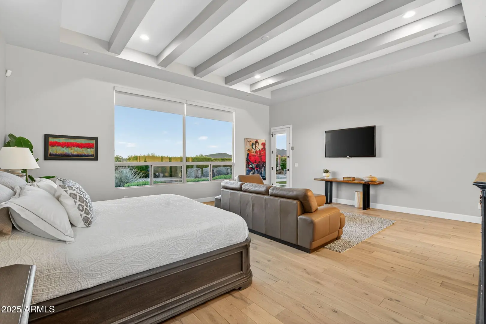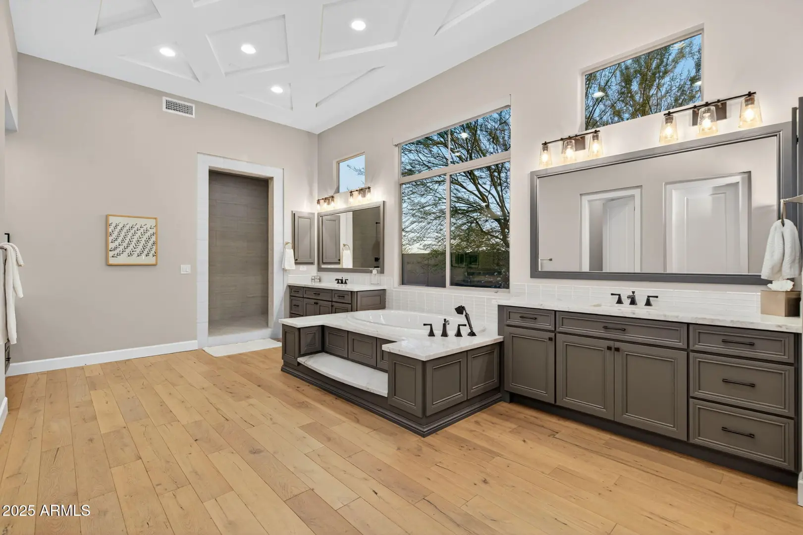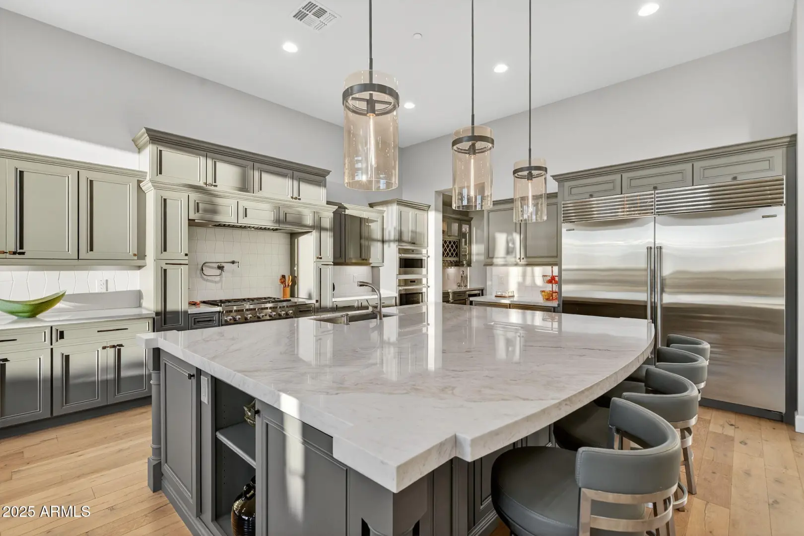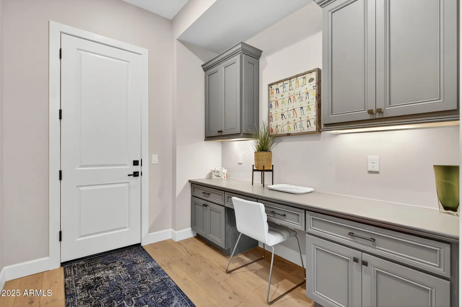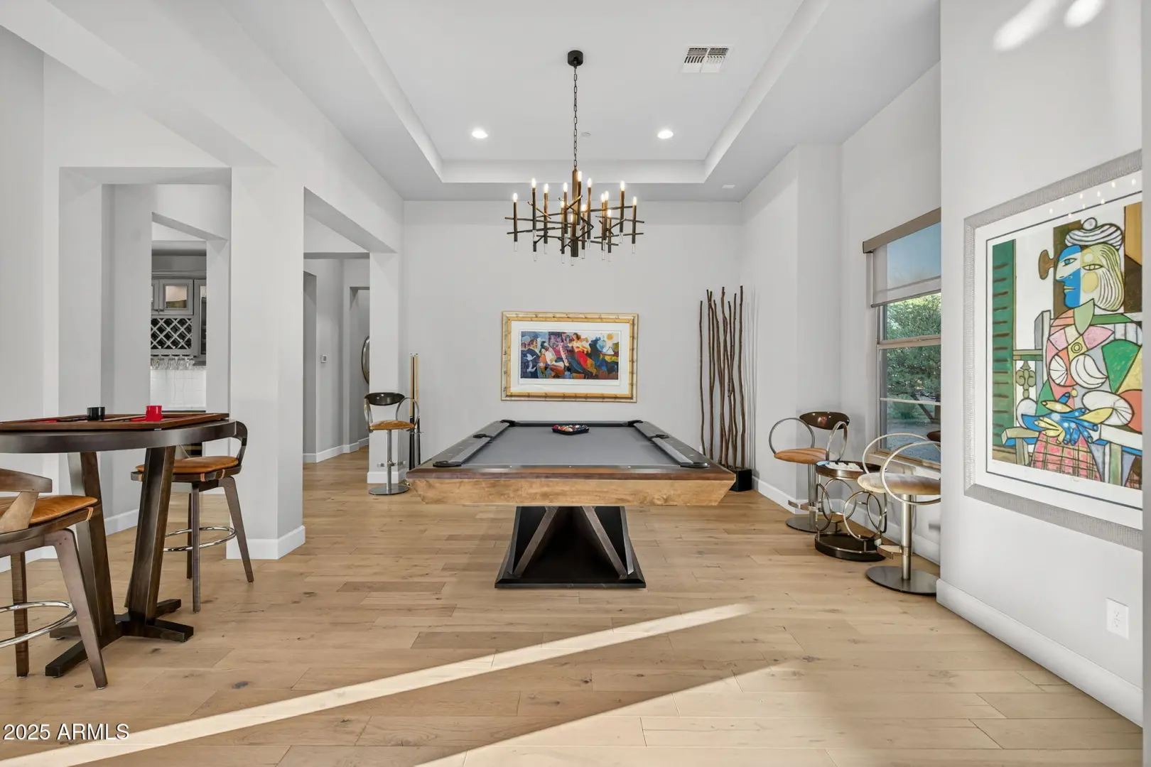 This stunning, highly upgraded, Rosewood Desert Contemporary home is located on an elevated lot offering spectacular sunset and mountain views within the secluded gated enclave of Rosewood Summit Estates. The spacious open floorplan features an interior courtyard with outdoor fireplace and two disappearing walls of glass that allow for seamless enjoyment of Arizona's glorious indoor/outdoor living. Luxurious updates include deco paneled entrance foyer, beautiful contemporary limestone fireplace, automated blinds, whole home water filtration, and a butler's pantry with built-in wine fridge. The gourmet chef's kitchen offers a huge island w/ bar seating, Subzero/Wolf appliances, marble countertops, upgraded cabinetry w/ upper glass doors, and walk-in pantry. The expansive master suite