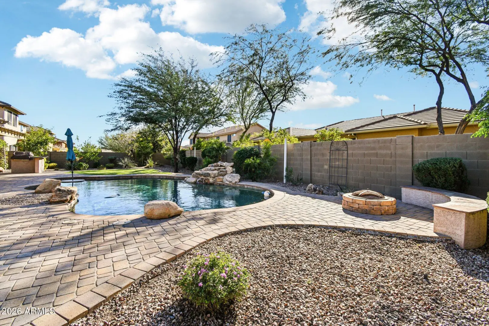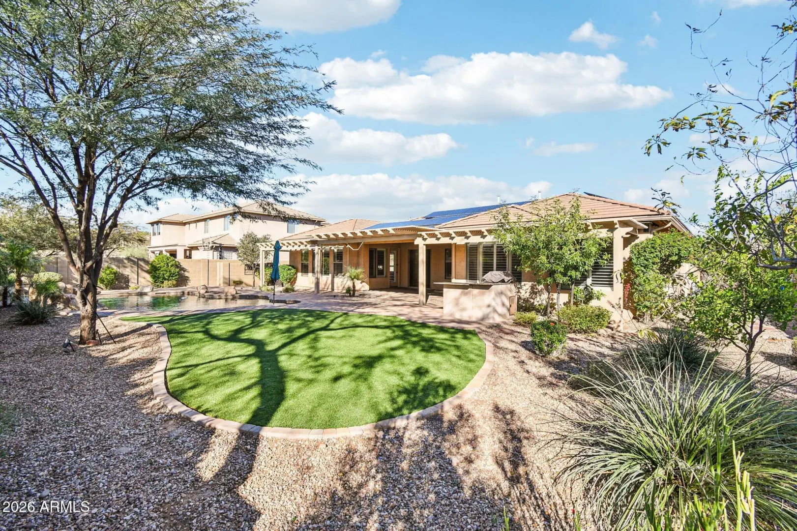 BOATS & RV ALLOWED w/ OWNED SOLAR $25 was average electric bill the past year! Located in the highly desirable Arroyo Grande neighborhood of the award-winning Anthem community, this exceptional home sits on a spacious 1/3-acre lot designed for both luxury and functionality. Bring all your toys: boats, RVs & trailers. Home has two RV gates, dedicated RV parking w/ 50AMP service & 3-car extended garage. The backyard is an entertainer's dream, featuring a sparkling pool w/ waterfall, fire pit, built-in BBQ, synthetic turf, expansive pergola, and pavers throughout. Enjoy minimal utility bills thanks to the owned solar system, along with 2 new air conditioners & new tankless water heater. Inside, the kitchen offers a large island, breakfast bar, walk-in pantry, gas cooktop & abundant storage.