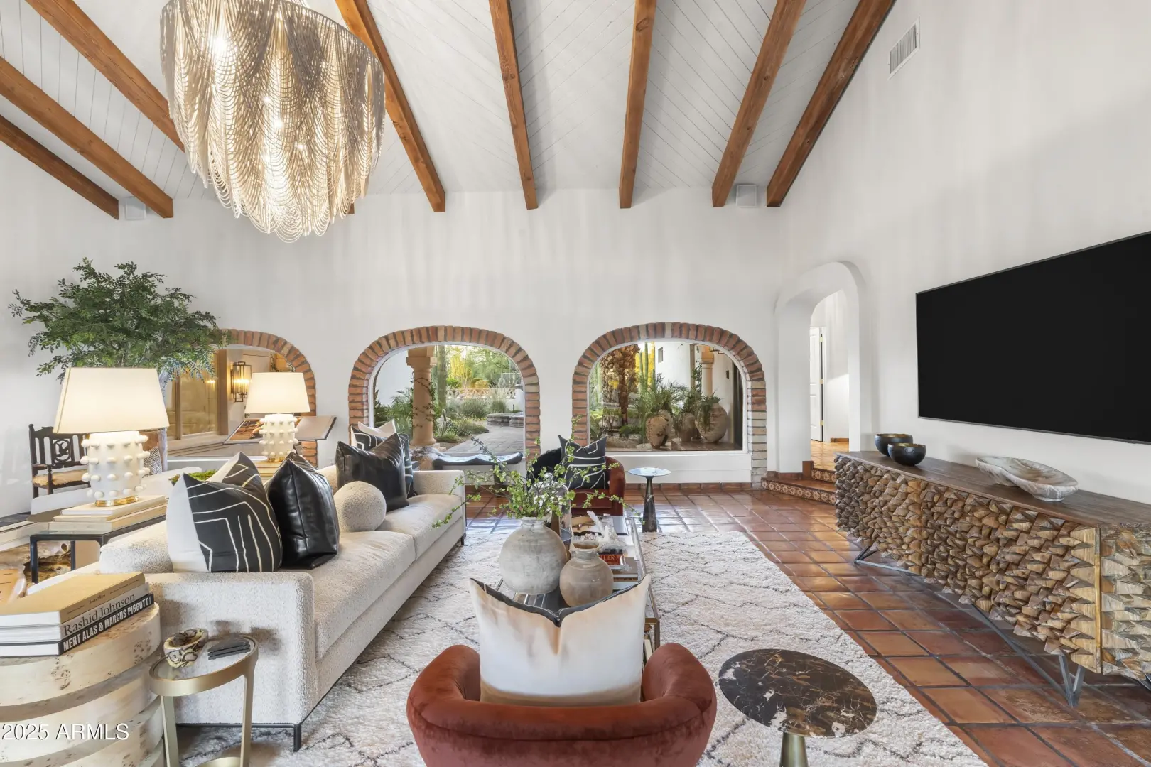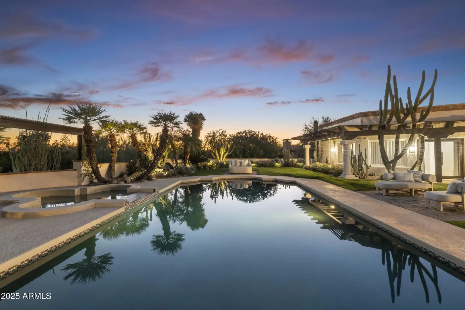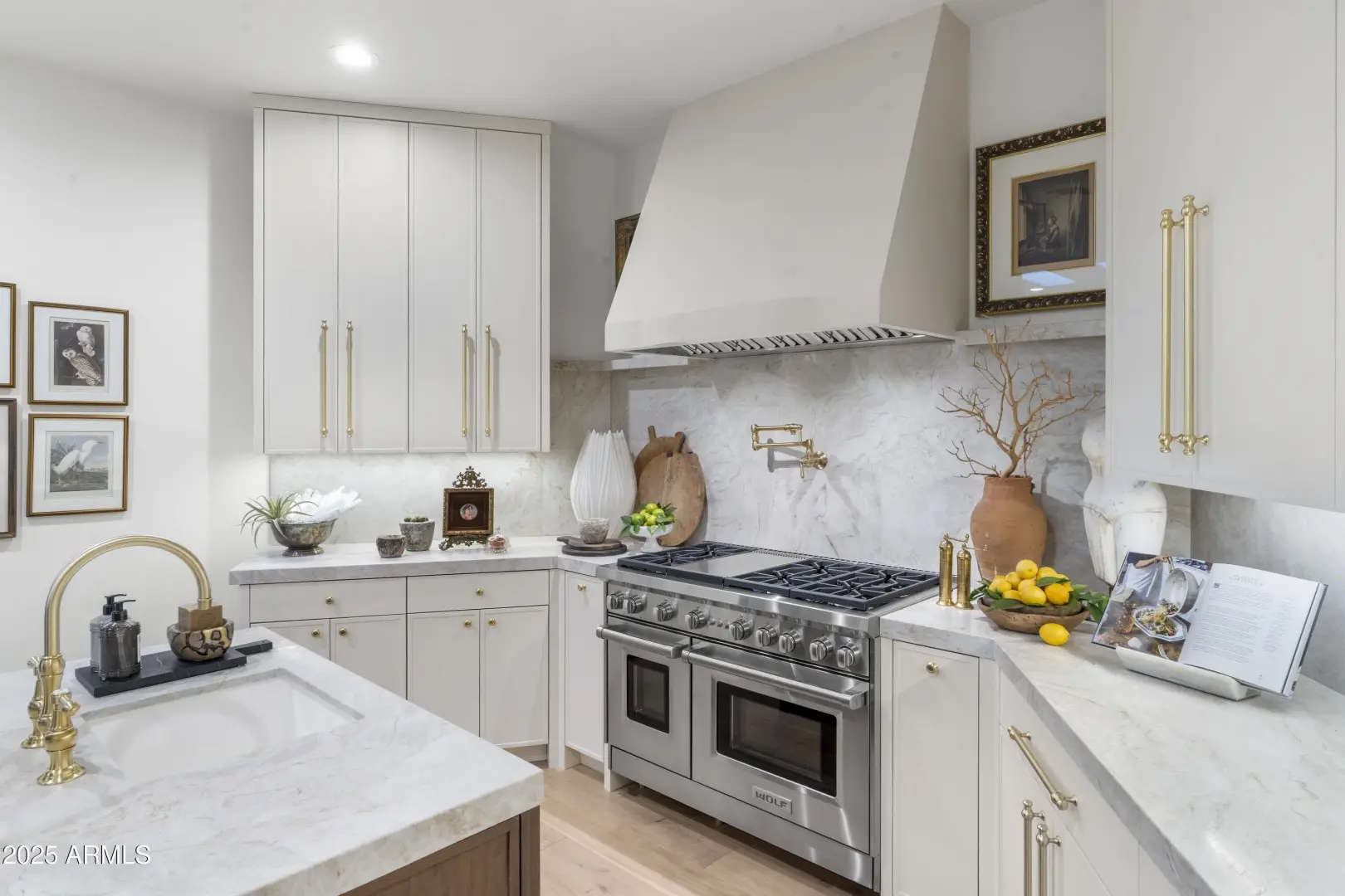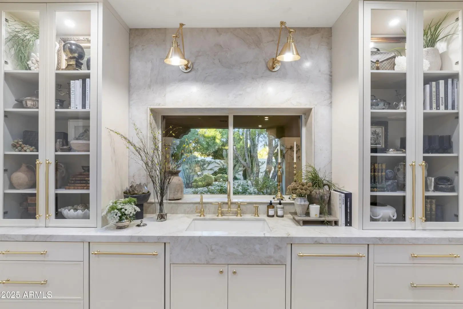 Composed with a curator's eye, Casa de Tesoros layers artisanal materials and tailored moments: bespoke cabinetry wrapped in Taj Mahal quartz, countertops, backsplash, even the window surround, frames a Wolf double range and Sub-Zero refrigeration. The $1.2M reimagining by Curated Design | Lindzey Lawler underscores the home's central idea: distinction over sameness, craft over trends. Beyond the windows, the backyard reads like a private resort. Lush, layered landscaping softens the desert edge while framing uninterrupted golf-course and mountain vistas. A shimmering pool anchors the composition, catching the afternoon light like cut stone, with generous decking for lounging and alfresco dining. Thoughtful planting palettes of textural greens, sculptural succulents, and seasonal