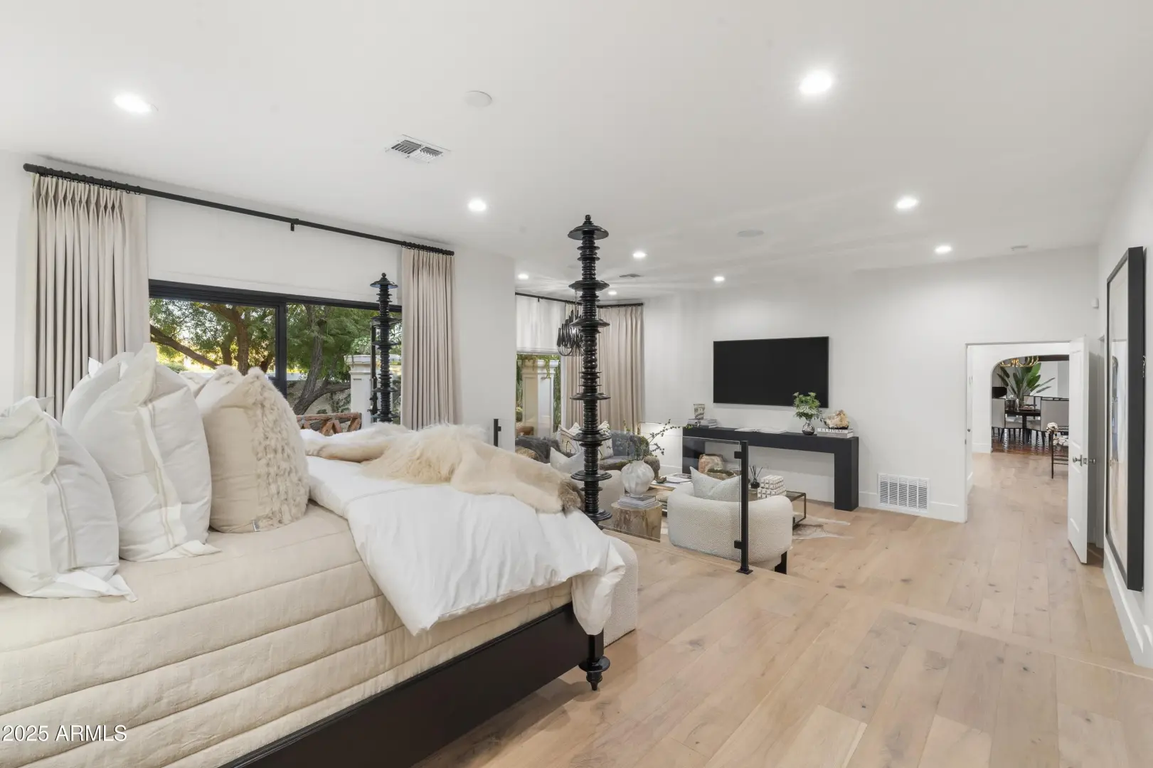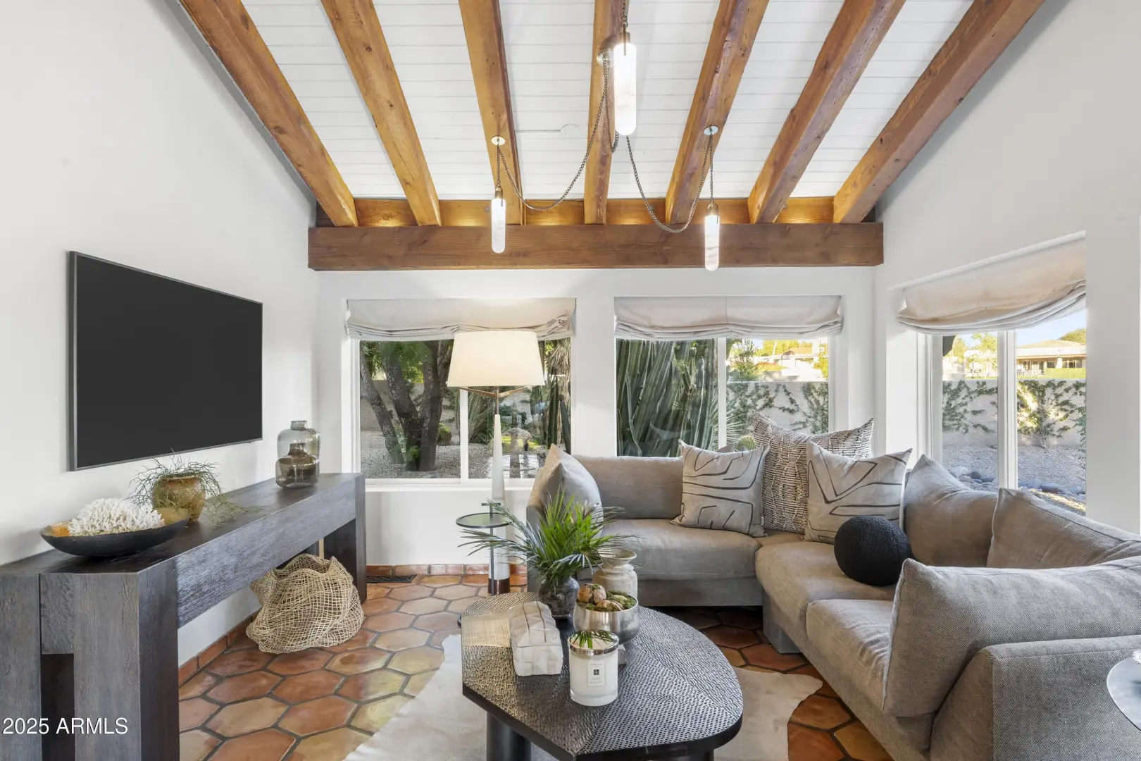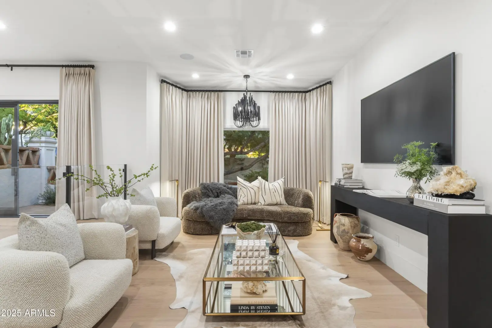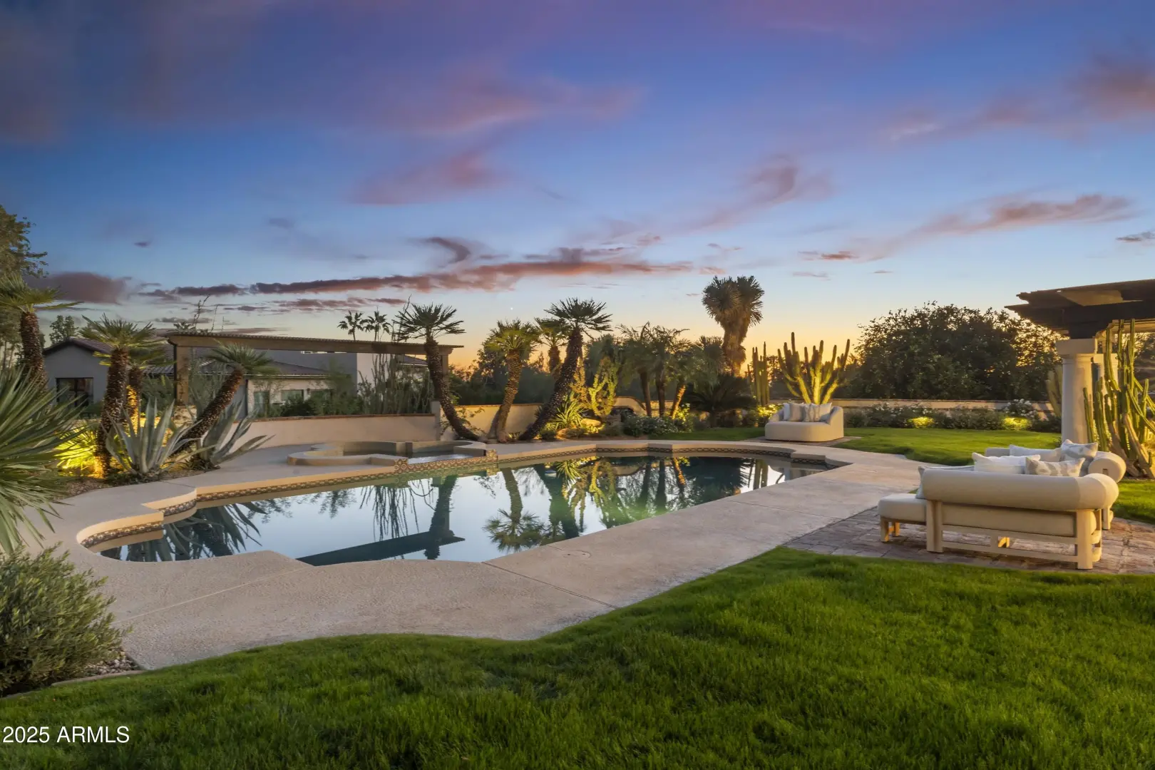 Composed with a curator's eye, Casa de Tesoros layers artisanal materials and tailored moments: bespoke cabinetry wrapped in Taj Mahal quartz, countertops, backsplash, even the window surround, frames a Wolf double range and Sub-Zero refrigeration. The $1.2M reimagining by Curated Design | Lindzey Lawler underscores the home's central idea: distinction over sameness, craft over trends. Beyond the windows, the backyard reads like a private resort. Lush, layered landscaping softens the desert edge while framing uninterrupted golf-course and mountain vistas. A shimmering pool anchors the composition, catching the afternoon light like cut stone, with generous decking for lounging and alfresco dining. Thoughtful planting palettes of textural greens, sculptural succulents, and seasonal